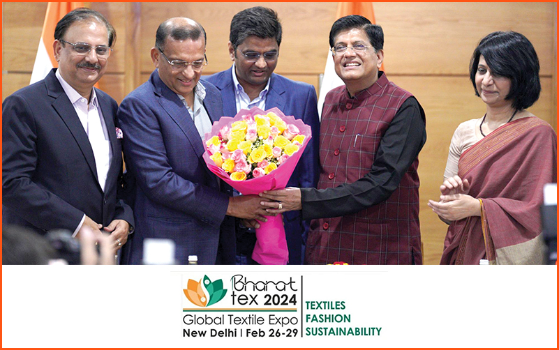 Union Minister of Textiles, Commerce & Industry, Consumer Affairs and Food & Public Distribution Piyush Goyal lauded industry bodies of the textile sector for their initiative in organising Bharat Tex 2024 – the largest ever textiles event, scheduled to be held from 26-29 February 2024 at state-of-the-art, world-class iconic destinations Bharat Mandapam at Pragati Maidan and Yashobhoomi at IICC, Dwarka, New Delhi. Presiding over the curtain raiser event for the show at Vanijya Bhavan, New Delhi, he emphasised that Bharat Tex 2024 Expo is not just an event but a testament to India’s commitment to becoming a global textile powerhouse. “With innovation, collaboration, and the Make in India spirit at its core, this expo is the embodiment of our 5F vision – Farm to Fibre to Factory to Fashion to Foreign, making products not just for India but for the entire world”, he added. He also hoped that the marquee event, Bharat Tex 2024 Expo would propel the industry’s growth and showcase India’s potential as a mature, competitive global sourcing destination in the global textile industry. Minister also launched the fair logo, website and video at the event. He urged the industry to use this event to highlight India’s global strengths, its sustainability initiatives as well as its strengths across the value chain.
