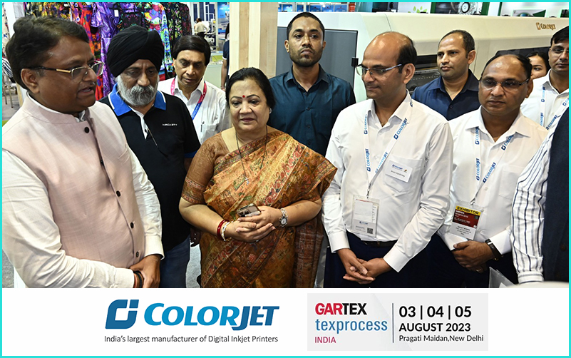 09 August 2023: ColorJet, a leader in digital printing solutions, has once again demonstrated its commitment to innovation and excellence by showcasing advanced digital textile printing machines at recently concluded Gartex Texprocess India 2023. The event held at Pragati Maidan from 03-05 August 2023, garnered significant attention from industry and even received an esteemed visit from the Union Minister of Textiles, Darshana Jardosh. The ColorJet team was privileged to host the Union State Minister of Textile and Railways, at the ColorJet Booth during her engaging visit to the Gartex exhibition.